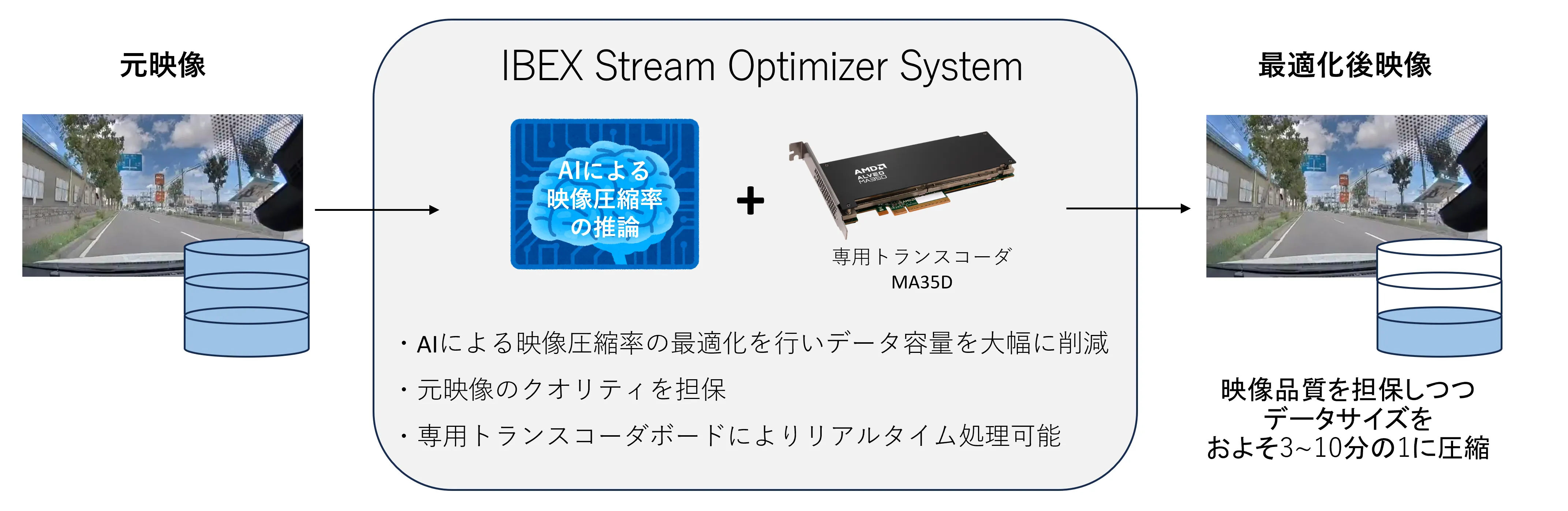 AIによる映像圧縮率の最適化を行い、画質を担保したまま、データ容量を大幅に削減(3~10分の1)することで、クラウドのストレージコスト削減を可能にします。 元映像のクオリティは、画質評価指標の1つであるVMAFで計測し、担保いたします。 専用トランスコーダボードとしてAMD様のMA35Dを使用することにより、スループットを出しにくいAV1のようなフォーマットでも、リアルタイム処理が可能になりました。