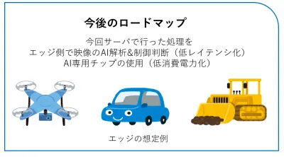 今後のロードマップとしては、今回GPUサーバ上で行った処理を、エッジ側で行うことで低レイテンシ化、AI専用チップを用いることで低消費電力化など、リソース最適化を行っていく取り組みを進めていきます。