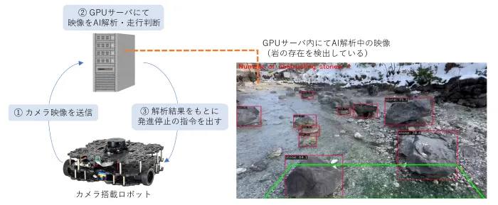 ロボットからGPUサーバへカメラ映像を送信し、サーバ上でAI解析を行い、解析結果に基づいてロボットを発進または停止させます。